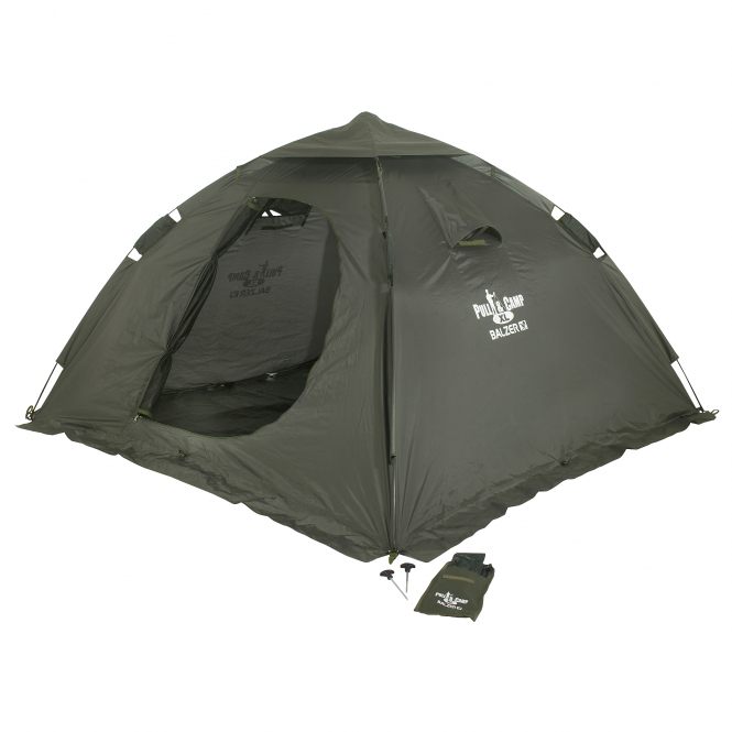These innovative tents can be erected within 1 minute and offers space for two carp bed chairs. The floor can be removed and the side windows have built in mosquito netting. With an internal holding loop for attachment of a lantern. Delivered including spikes. Water resistance to 4,000mm. Dimensions: 250 x 250cm, height: 160cm. Weight: 6kg. Colour: olive. Tent material: 100% polyester, water-resistant coating, Groundsheet. 100% nylon.