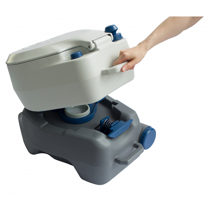 Ideal for camping, travelling and on the boat. The seat and bowl are equipped with an antimicrobial barrier that inhibits odour and prevents the growth of fungi and mould. The toilet is equipped with an extra strong locking system to connect the upper and lower tank. Seat height: 41 cm. With 16 l fresh water and 20 l waste water tank. Maximum load capacity: 130 kg.