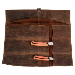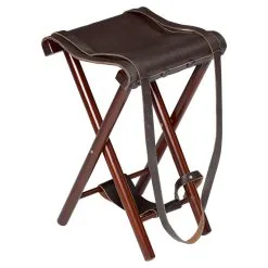 A four legged stool with a large seating area and sturdy legs. With carrying strap. Height: 55 cm Seating area: 35 x 34 cm. Material: Leather (Seat) & Wood (Legs).