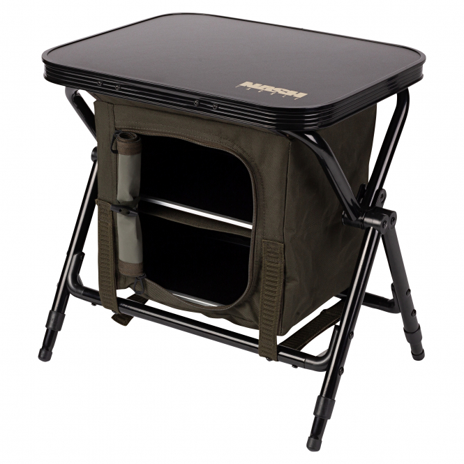 Flat folding compact storage solution with work surface. Adjustable legs for straight stand. Two stiffened compartment inserts. Includes zip carry bag. Dimensions: 40 x 40 cm. Work surface: 40 x 33 cm.