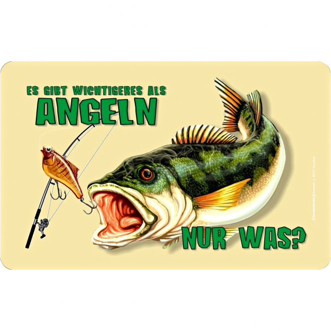 With a fish motif and the text “ES GIBT WICHTIGERES ALS ANGELN – NUR WAS?” (“there’s more important things than fishing – only what?”). Made of melamine coated Resopal. Dimensions: 23.5 x 14.5 cm.