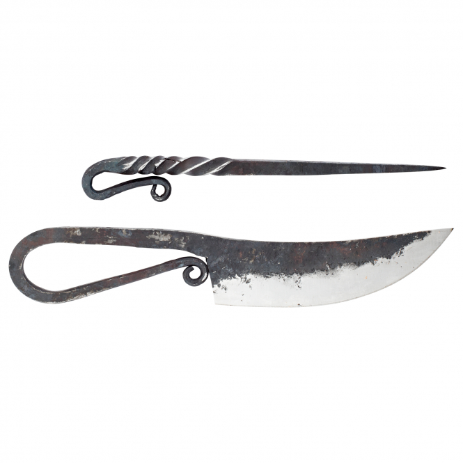 The Medieval cutlery set is made of iron and at the handle it is twisted. It was hand forged. Each cutlery set is unique. With a leather sheath. Scope of delivery: Knife, eating spike, leather sheath. Material: Iron. Knife blade length: 11 cm, total: 19,5 cm, weight: 98 g. Eating spike length: 16 cm, Weight: 44 g.